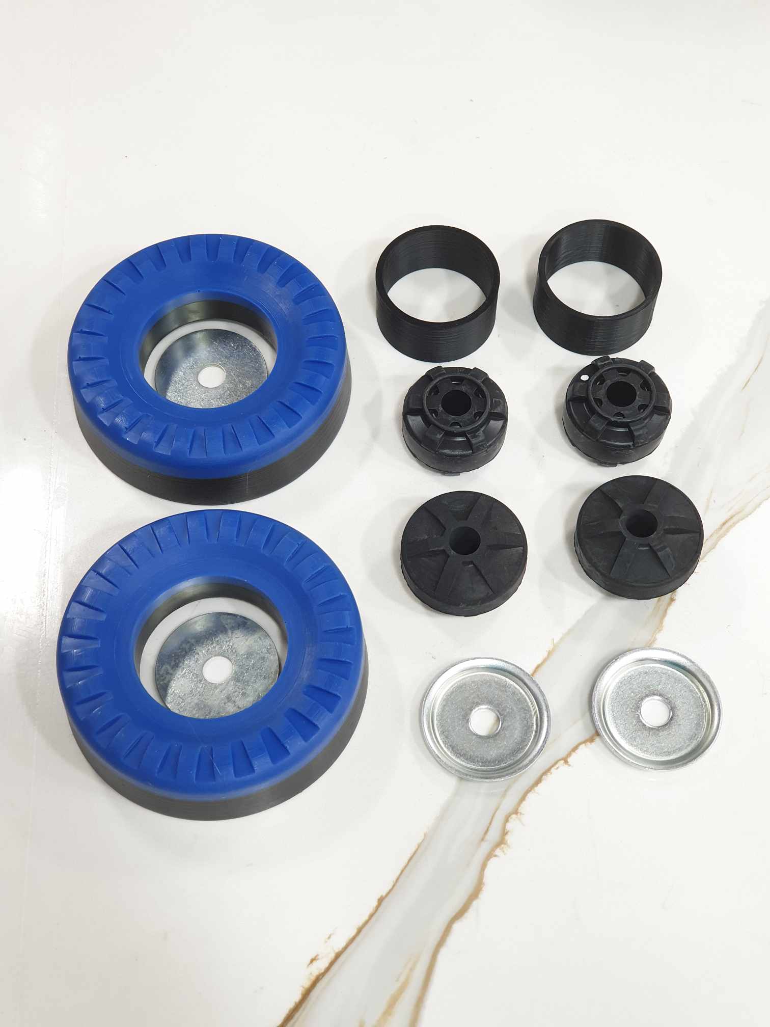 2 OEM Rear Strut Bushings Kits. 1 Rear Coilover Spring Sleeve pair. and 1 Rear Spring Bushing pair.